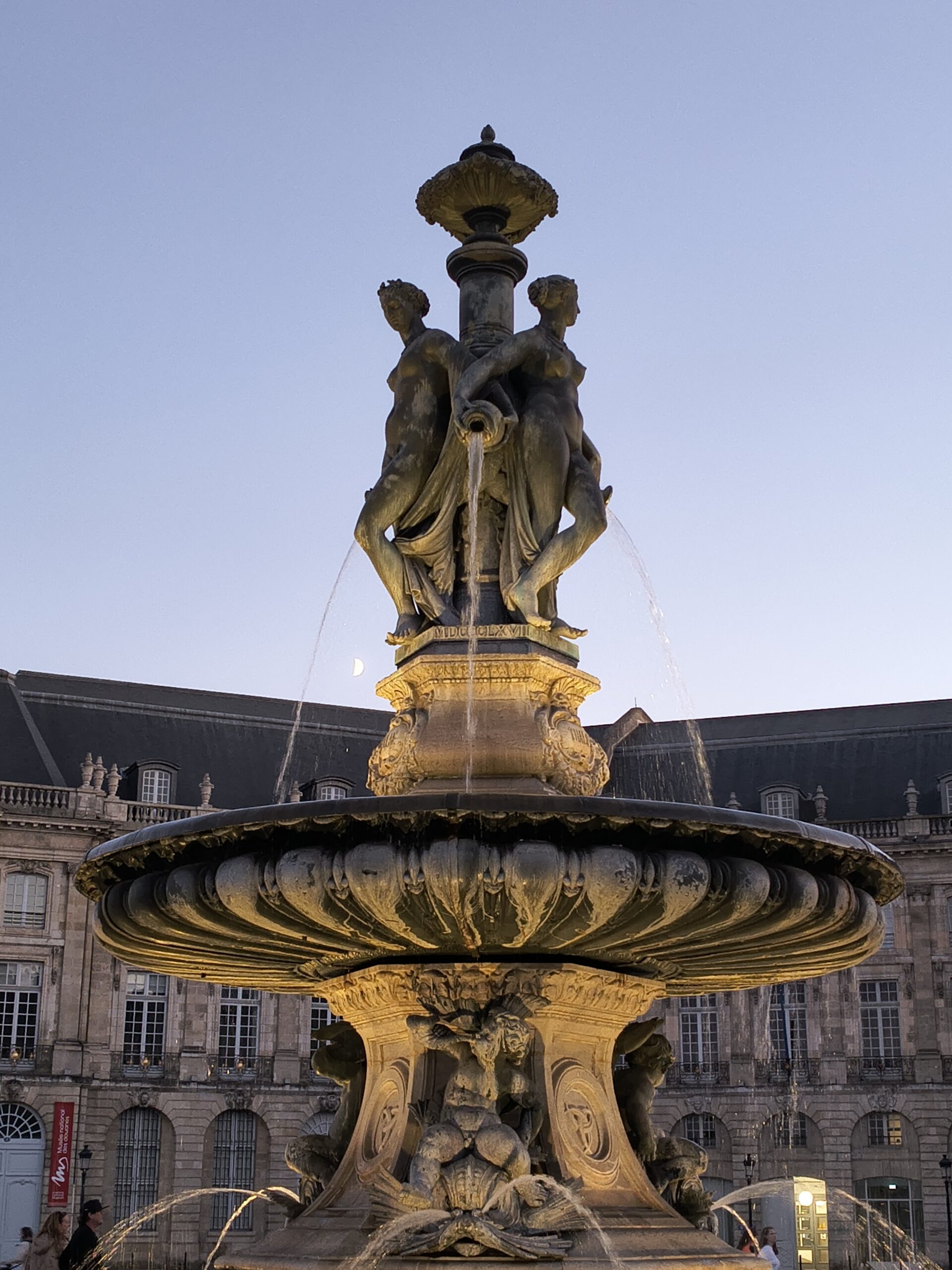 “Each day, the Three Graces watch over my steps—bronze goddesses, guardians of elegance ⛲. Beneath their gaze, I’ve seen the idyllic moon 🌔, the blazing sun ☀️, the sky in its purest blue 🩵, the gentlest breezes 🌬️, and the ocean’s freshness carried by the Garonne 🌊. Their frozen dance lights up Place de la Bourse 🏛️, mirrored in the shifting beauty of the Miroir d’eau 🪞, offering me the world’s sincerest smiles 💖 and wrapping me in an inner peace 😌—that of living in Bordeaux with grace and gratitude 💐.”📍Fontaine des Trois Grâces, Bordeaux